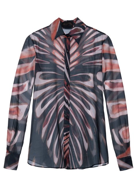 Camisa sofisticada confeccionada em organza com estampa de borboletas, que combina leveza e elegância com toque contemporâneo. O modelo apresenta gola clássica, pé de gola e punhos estruturados, garantindo caimento refinado e aparência translúcida sutil. Ideal para sobreposições elegantes e composições modernas.