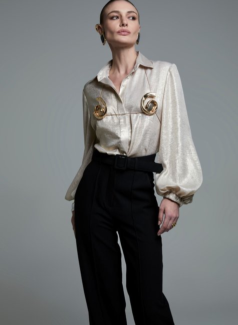 Camisa perolada com design elegante e contemporâneo, confeccionada em tecido laminado de leve brilho. A modelagem clássica é atualizada por detalhes sutis, como o punho com elástico que cria um efeito levemente franzido e acabamento sofisticado na gola e abotoamento. Ideal para produções que equilibram modernidade e sofisticação.