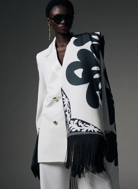 Estola com proposta sofisticada e visual marcante, desenvolvida em combinação de alfaiataria Madrid estampada e matelassê. O modelo apresenta desenho estruturado que valoriza o volume e a presença do acessório, enquanto as franjas de seda aplicadas nas extremidades acrescentam movimento e delicadeza ao visual. Uma peça pensada para complementar produções elegantes e elevar looks de ocasião especial com acabamento refinado.