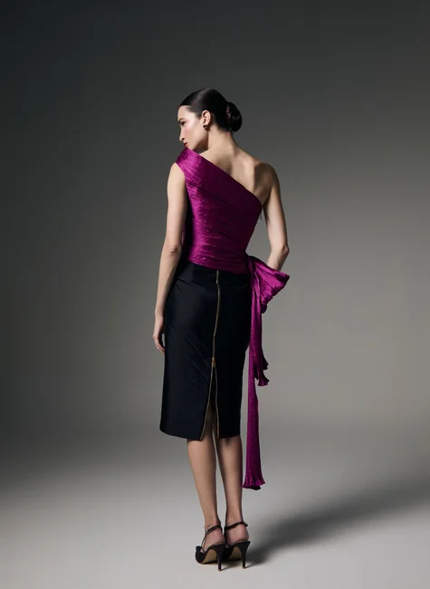Desenvolvida em zibeline, tecido nobre de estrutura encorpada e superfície levemente acetinada, a saia mantém aparência alinhada e sofisticada. A base valoriza o desenho dos recortes e sustenta a modelagem com elegância.