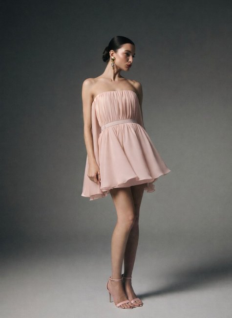 Vestido mini/curto desenvolvido em musseline com desenho fluido e refinado. O modelo apresenta decote tomara que caia com estrutura interna que valoriza o busto e mantém a linha do colo harmoniosa. Todo o corpo é estruturado sobre tela de armação, conferindo forma e sustentação ao design. A partir das costas, surge uma capa no mesmo tecido, criando movimento leve e efeito alongado ao caminhar. Na linha da cintura, o cinto em tafetá marca a silhueta com contraste sutil e acabamento elegante. Uma peça indicada para eventos formais e ocasiões especiais que pedem leveza e imponência.