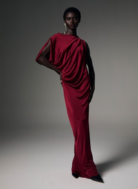 Confeccionado em jersey, o vestido apresenta toque macio e caimento fluido, acompanhando o movimento do corpo com naturalidade. A superfície levemente acetinada valoriza o drapeado e acrescenta sofisticação ao visual.