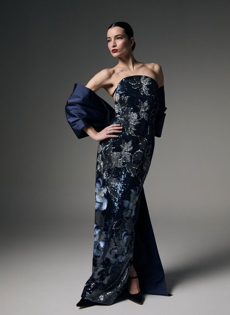 Confeccionado em paetê Flowers, o vestido apresenta superfície rica em brilho e textura, criando profundidade visual sofisticada. O tule illusion nas laterais oferece transparência sutil, enquanto o tafetá da capa acrescenta estrutura e contraste, reforçando a leitura luxuosa do modelo.
