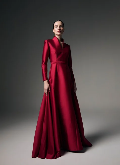Vestido longo com proposta sofisticada e linhas marcantes, desenvolvido integralmente em zibeline. O modelo apresenta gola alta que se abre em decote profundo em formato V, criando contraste elegante entre estrutura e sensualidade sutil. A peça é estruturada nos ombros e na cabeça de manga, conferindo presença à silhueta. As mangas longas ganham destaque pelos botões forrados aplicados no punho, acrescentando delicadeza ao design. Na linha da cintura, o cinto em tecido duplo define a silhueta com transpasse elegante, reforçando o desenho da peça. A barra em formato lenço acrescenta leve movimento ao conjunto, resultando em um visual imponente e refinado, ideal para eventos formais e ocasiões especiais.