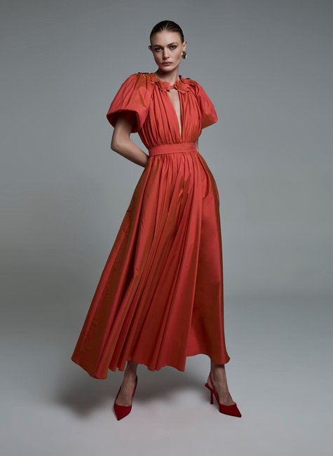 Confeccionado em tafetá, tecido de brilho estrutural leve, que confere elegância e presença visual, ideal para ocasiões especiais.