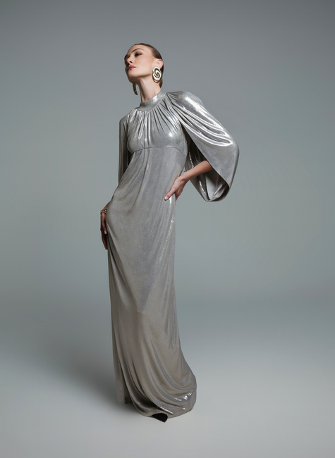 Vestido longo em jersey laminado que combina elegância e modernidade. A modelagem apresenta gola alta com mangas longas que se conectam à gola, criando um decote marcante nas costas e na frente. O caimento fluido valoriza a silhueta com sofisticação e movimento.